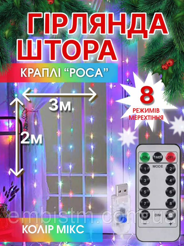 Гірлянда штора кольорова 2 на 3 метри USB на 200 LED RGB-лампочок фіранка з пультом у прозорому силіконі