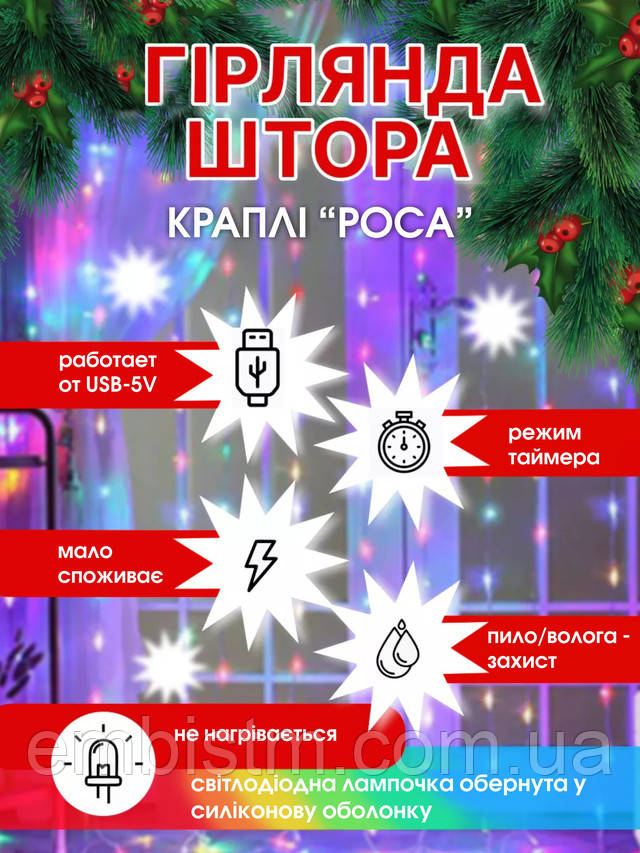 Дизайн, схожий на яскраву завісу. Завдяки компактному розміру 3х2 метри, завіса є ідеальним аксесуаром для декорування вікон, стін, дверних прорізів і багатьох інших поверхонь.