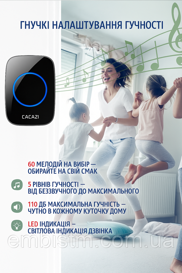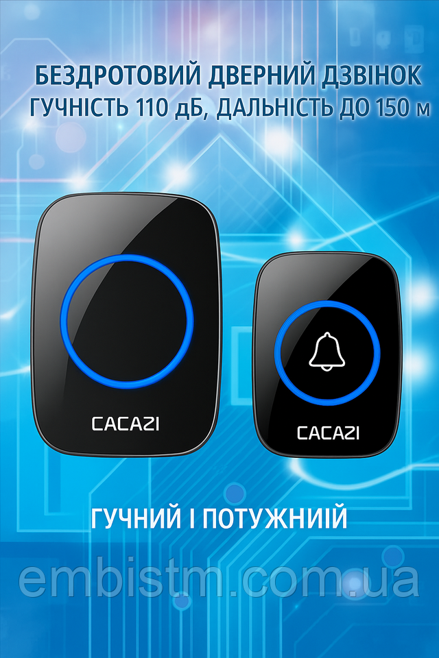 Бездротовий дверний дзвінок на вхідні двері Cacazi — це гарний і функціональний варіант дверного дзвінка для приватного будинку, офісу чи квартири. Головні його відмінності від звичайного електричного дзвінка — немає дротів і витрат часу під час їх прокладання, компактні розміри, монтаж бездротового дзвінка за 5 хвилин на будь-які поверхні.