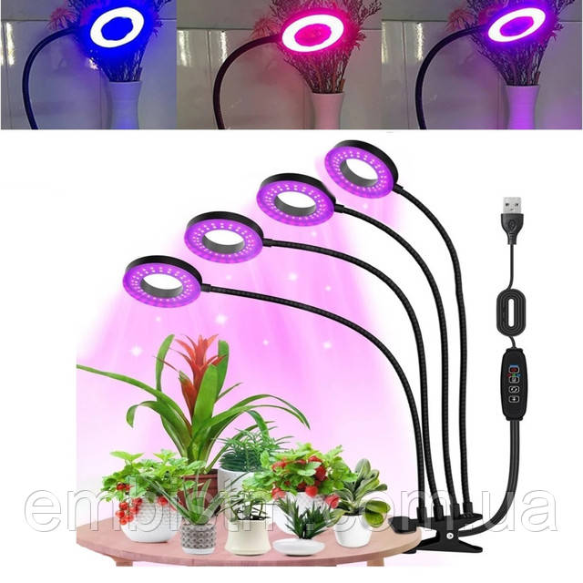 Фітолампа ультрафіолетова на 4 голови для рослин і квітів повний спектр на кліпсі гнучкий із таймером
