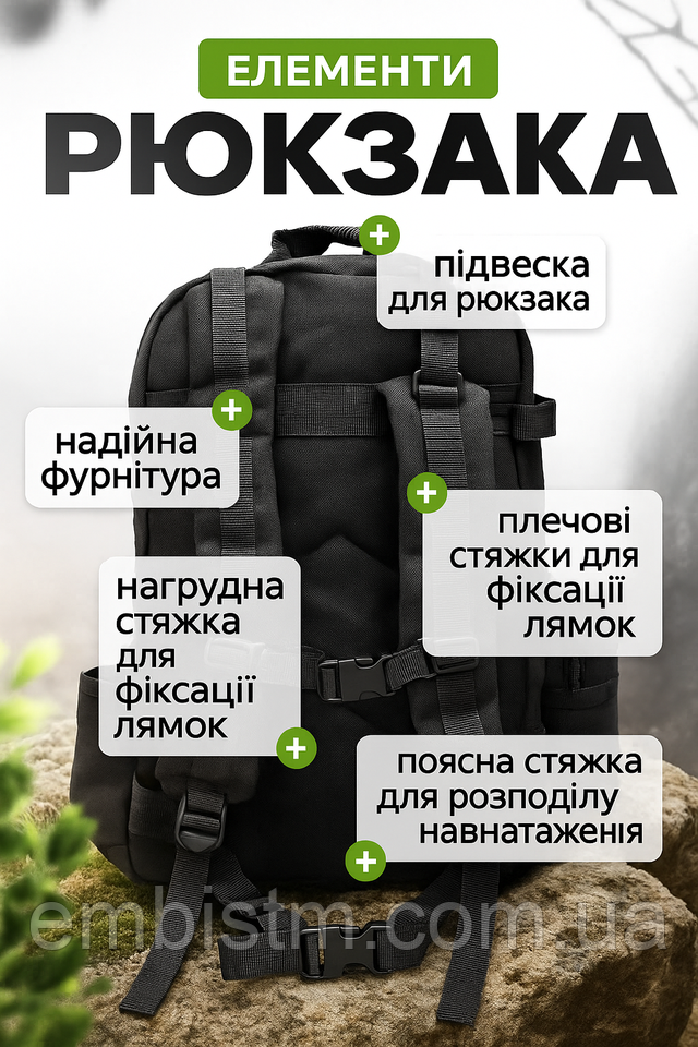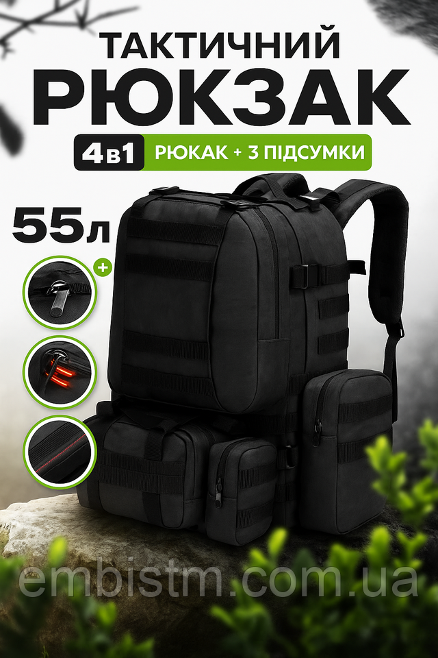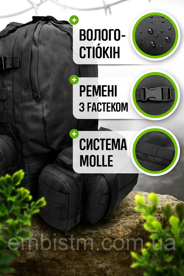Рюкзак Тактичний армійський EM55B на 55 літрів Чорний з підсумками та кріпленням MOLLE Військовий похідний